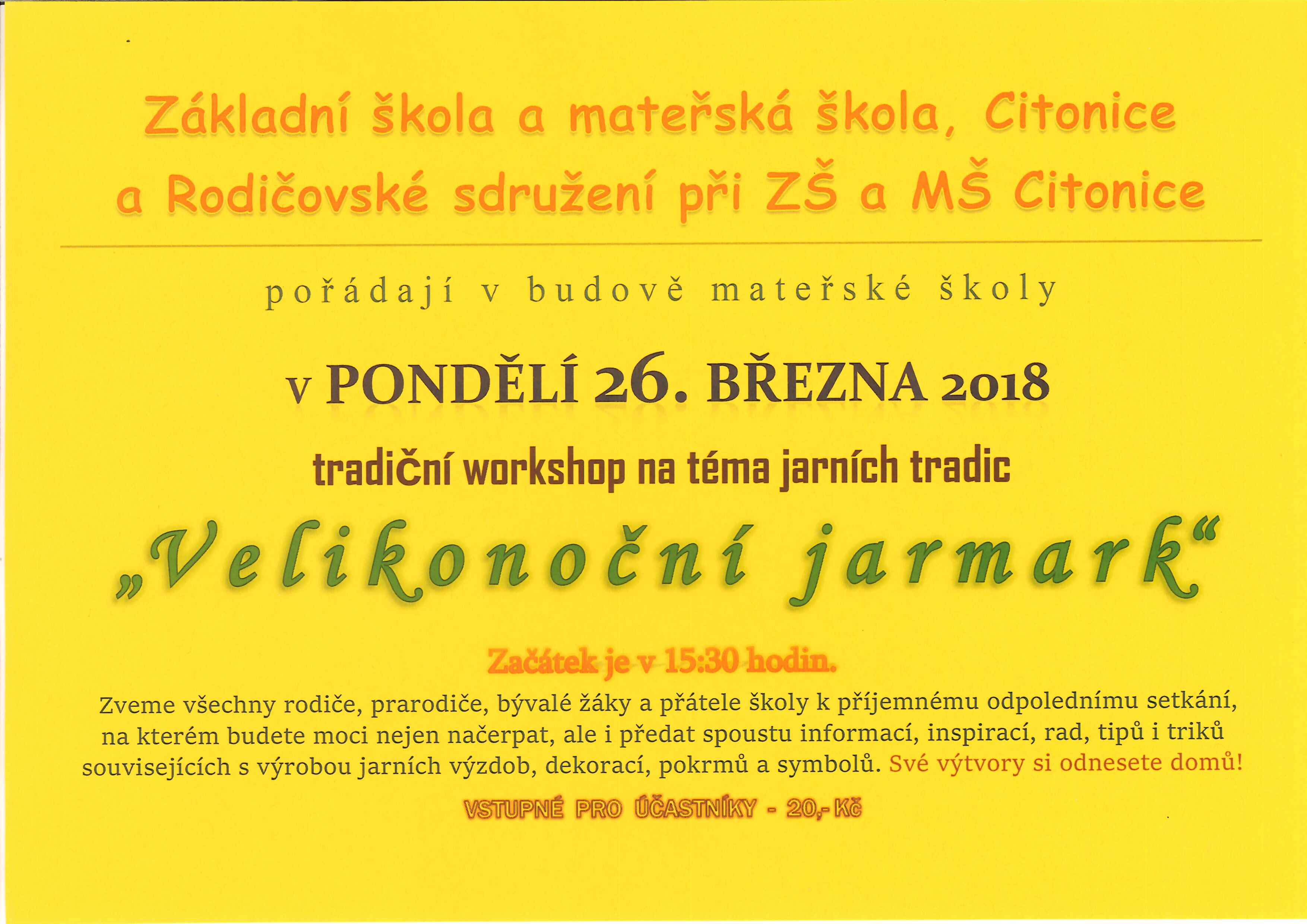 Velikonoce se nám nezadržitelně blíží a tak si Vás již nyní dovolujeme pozvat na tradiční Velikonoční jarmak, který pořádáme v budově mateřské školy v pondělí 26. března 2018 od 15:30 hod. Více viz. plakátek k akci.