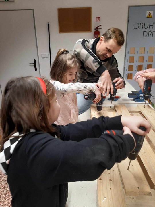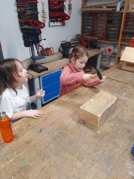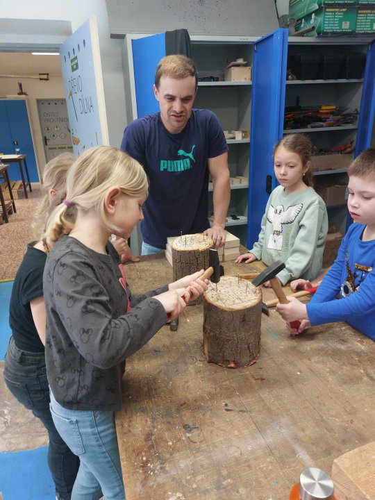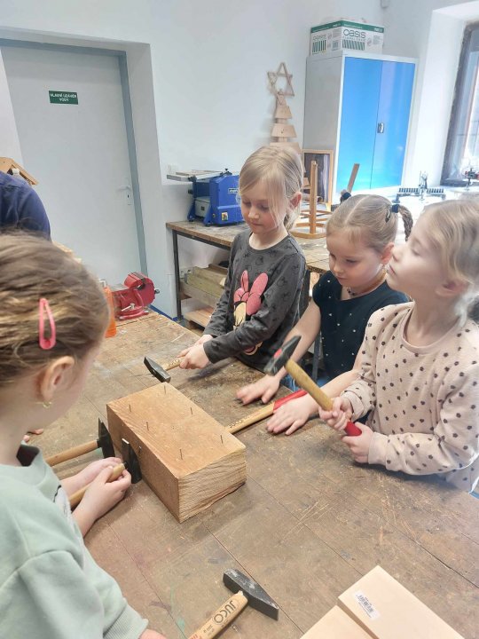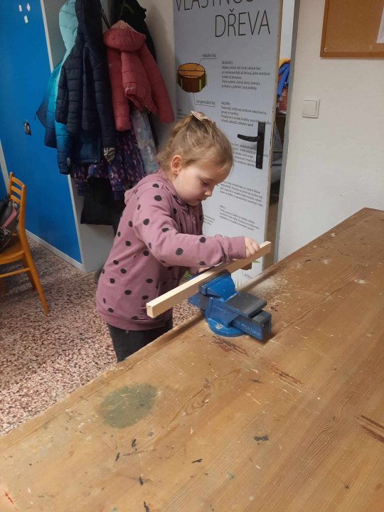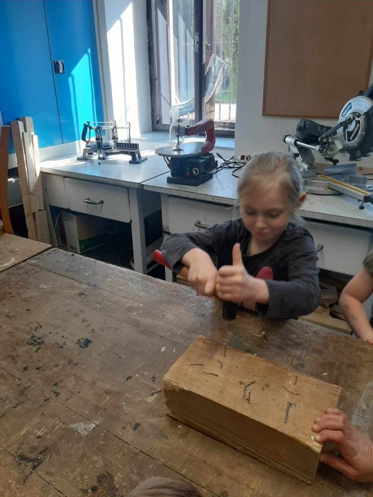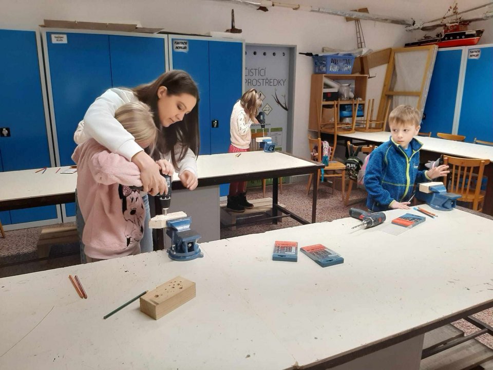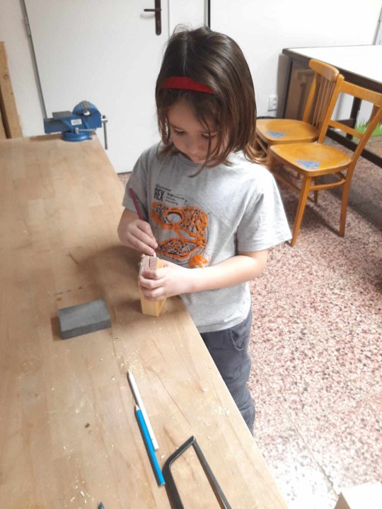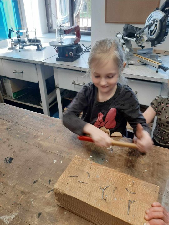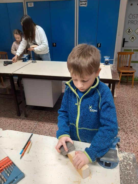 12. 3. - seznámení s dílnou a nářadím, práce se svěrákem, zatloukání hřebíků