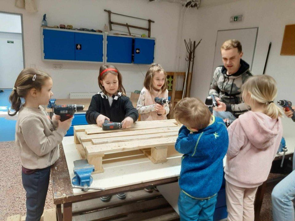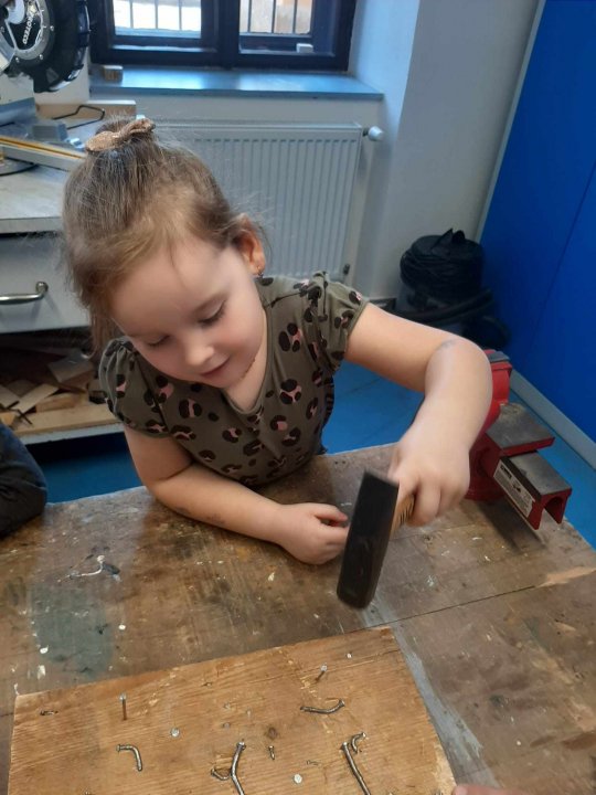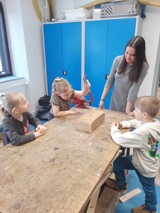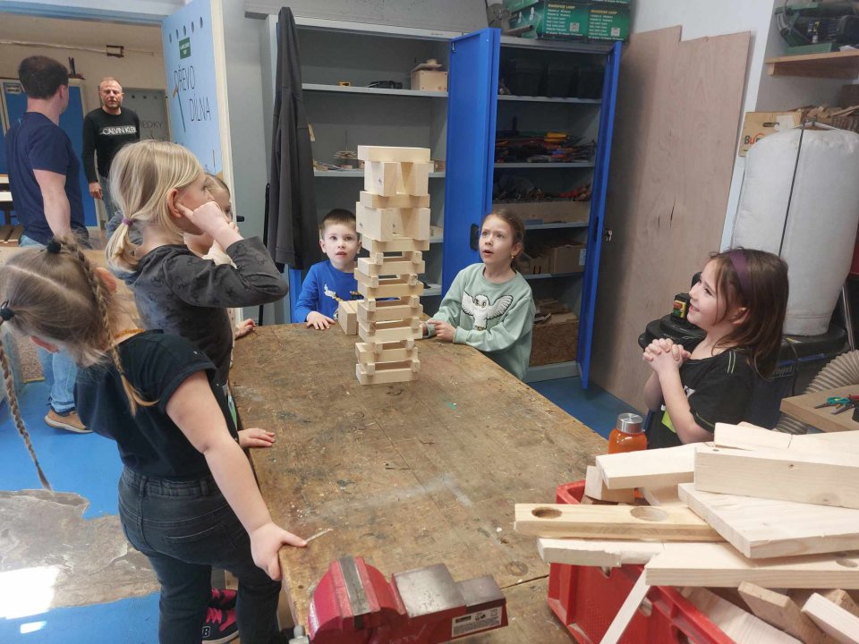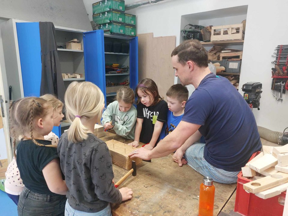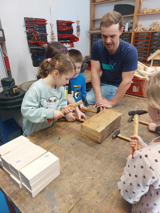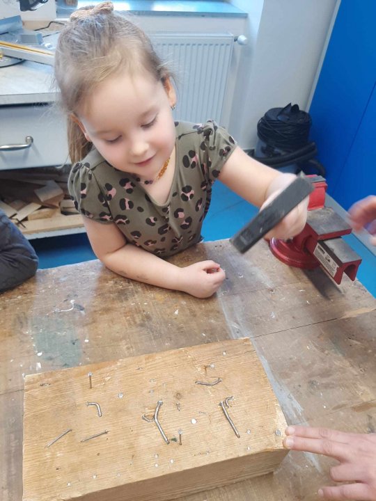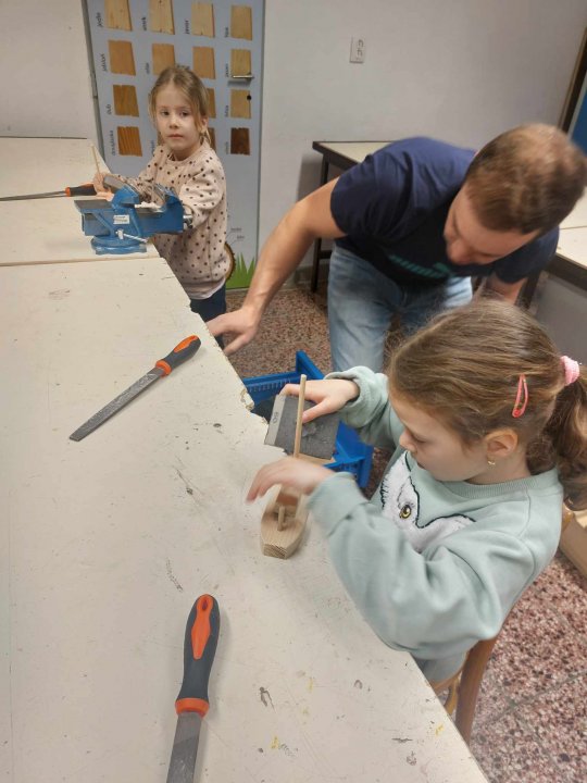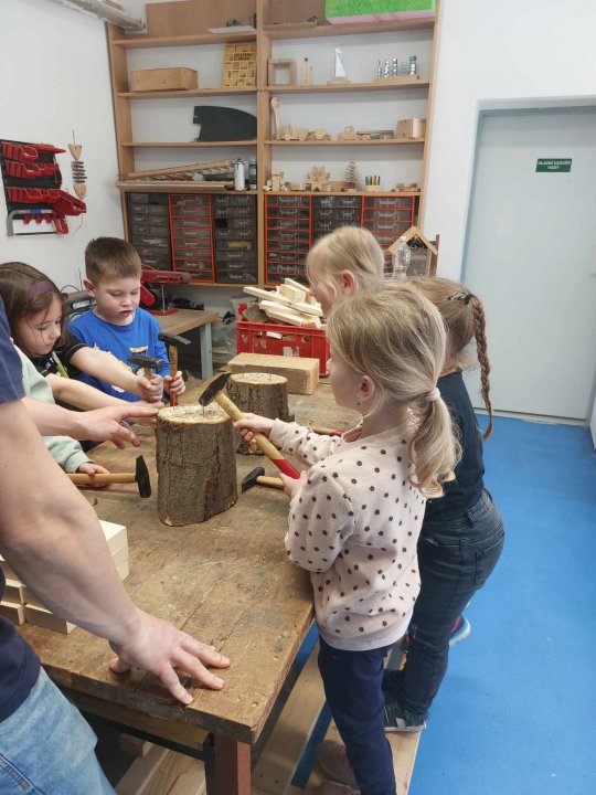 12. 3. - seznámení s dílnou a nářadím, práce se svěrákem, zatloukání hřebíků