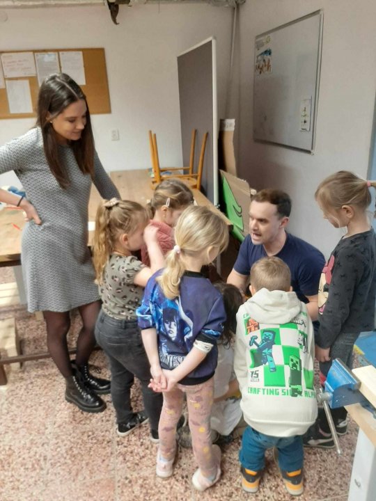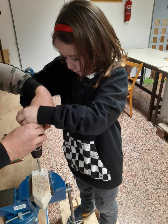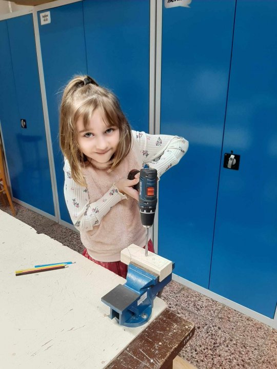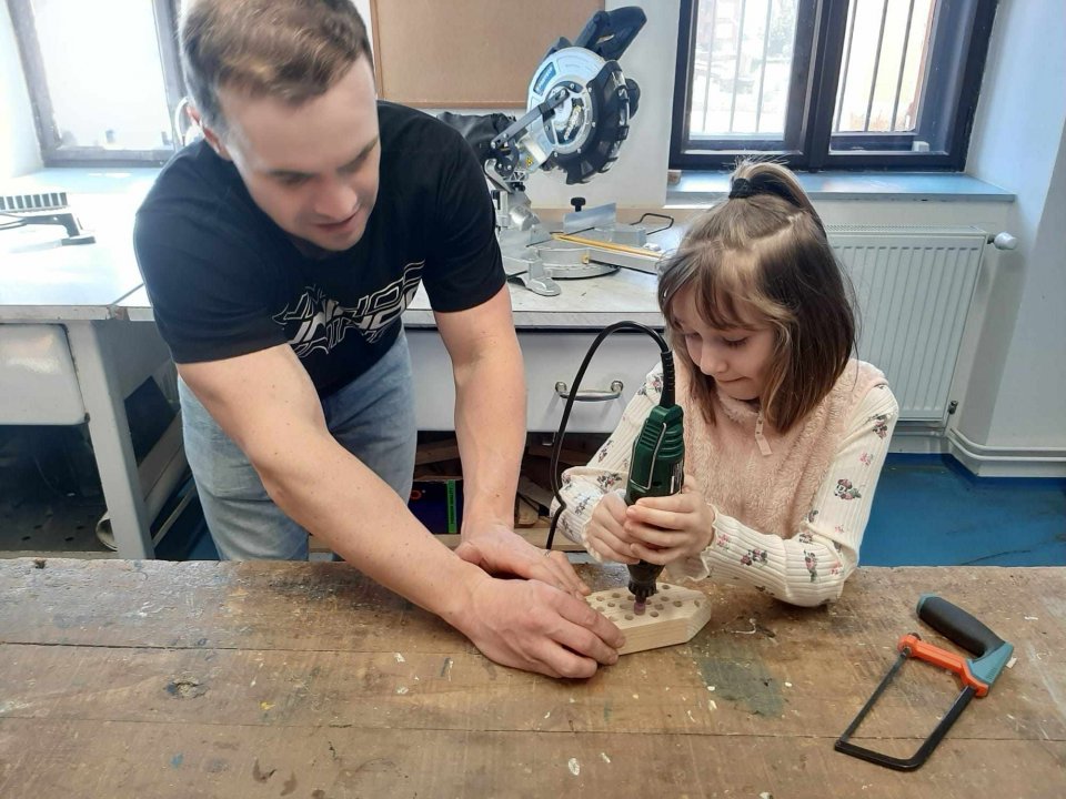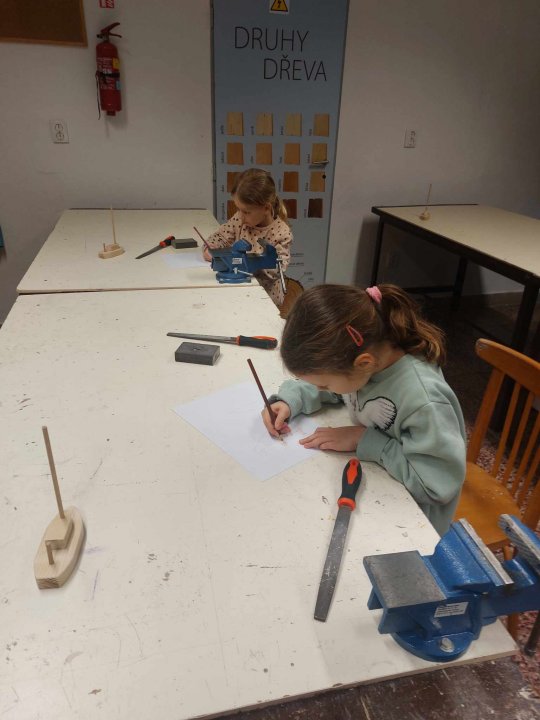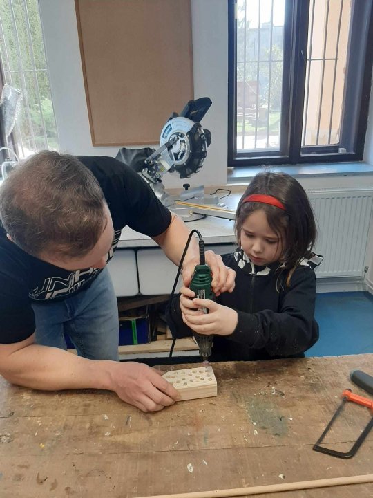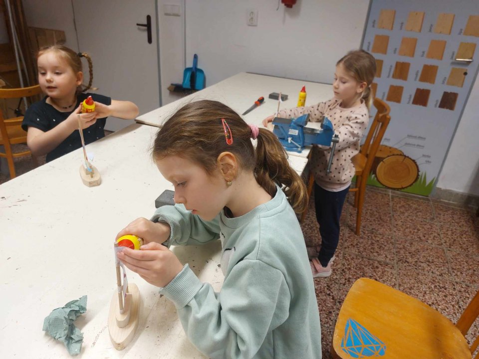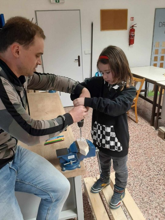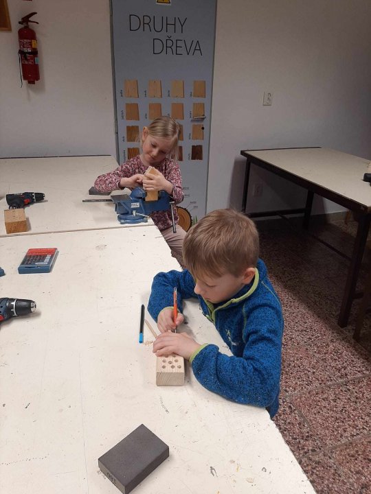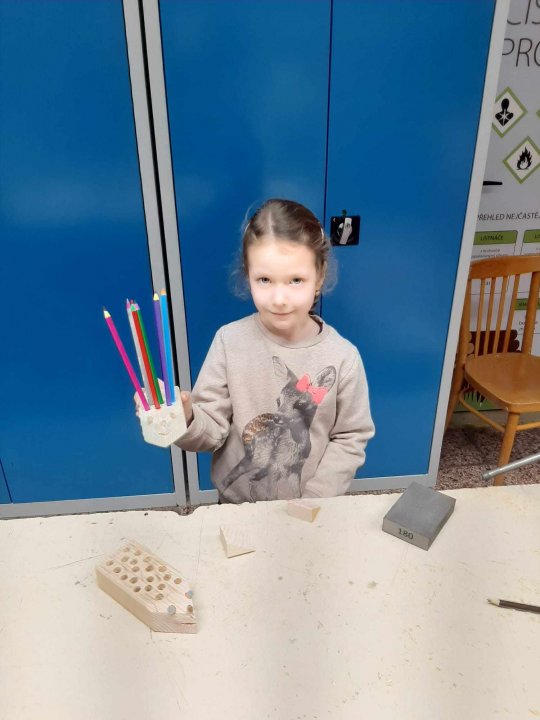 20. 3. - výroba pastelkovníku (ježka), práce s vrtačkou, broušení smirkovým papírem