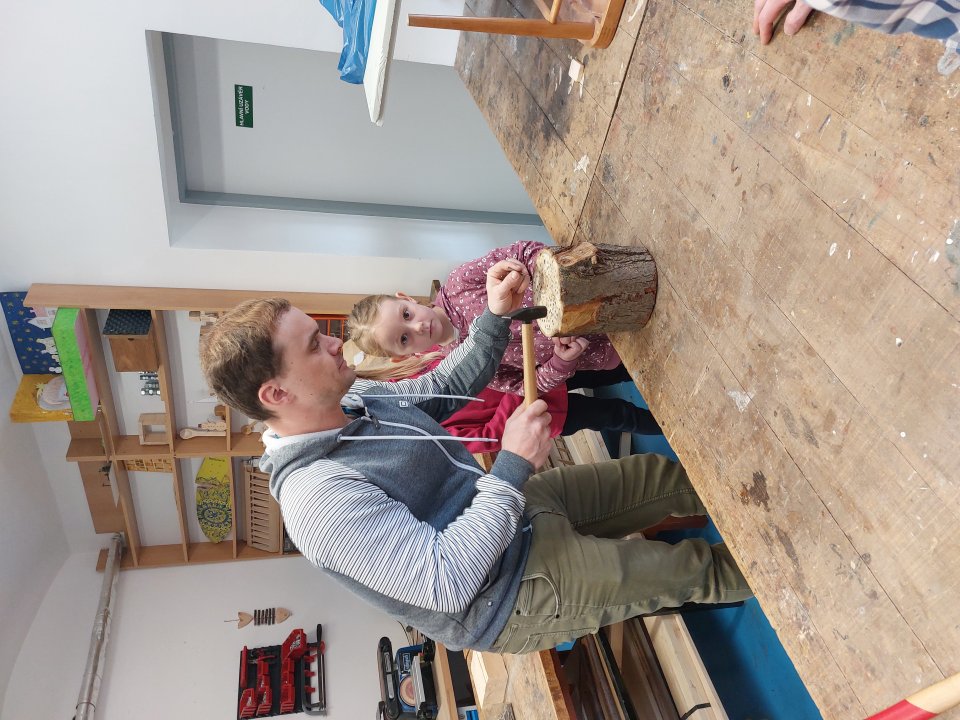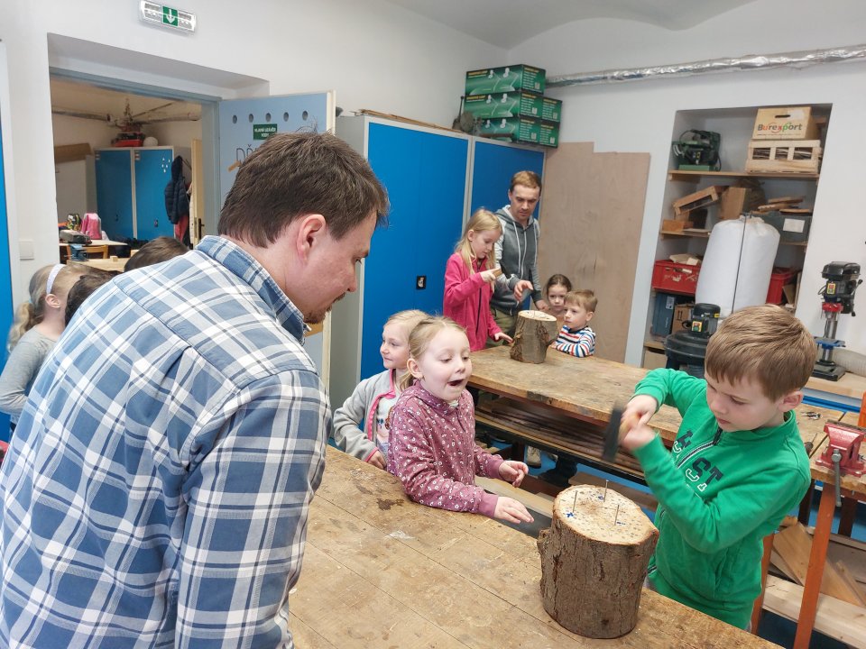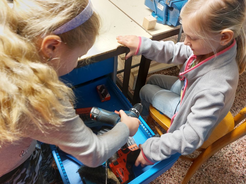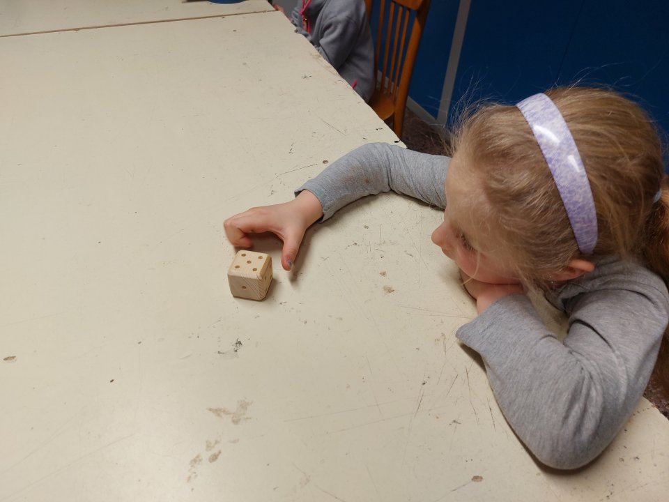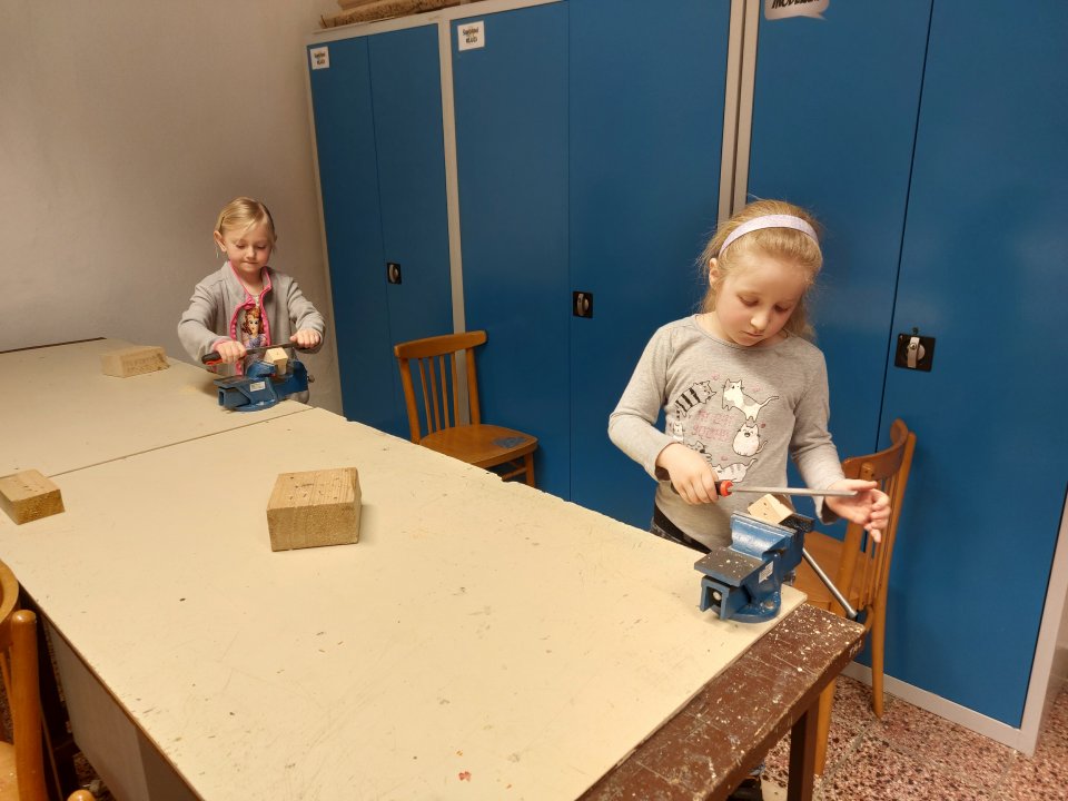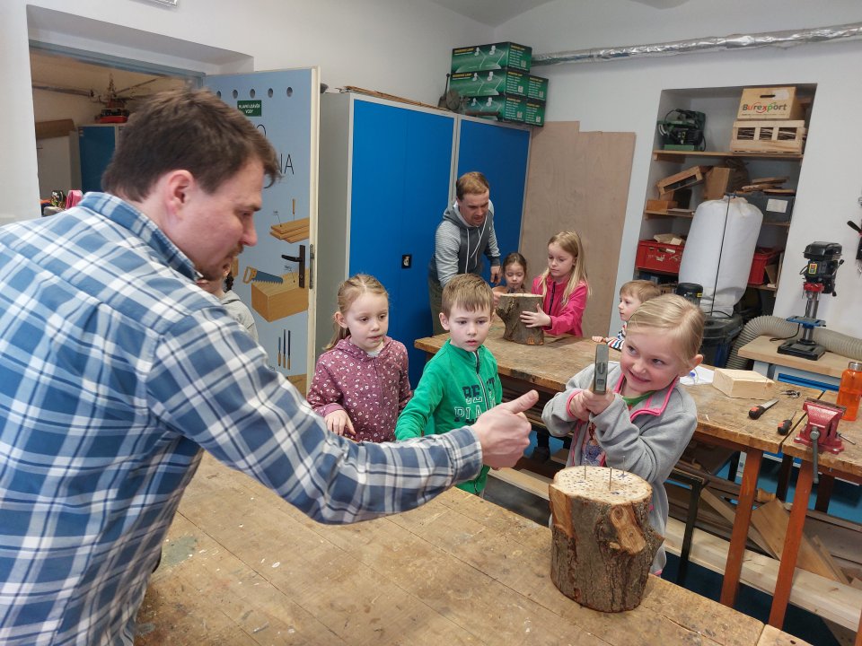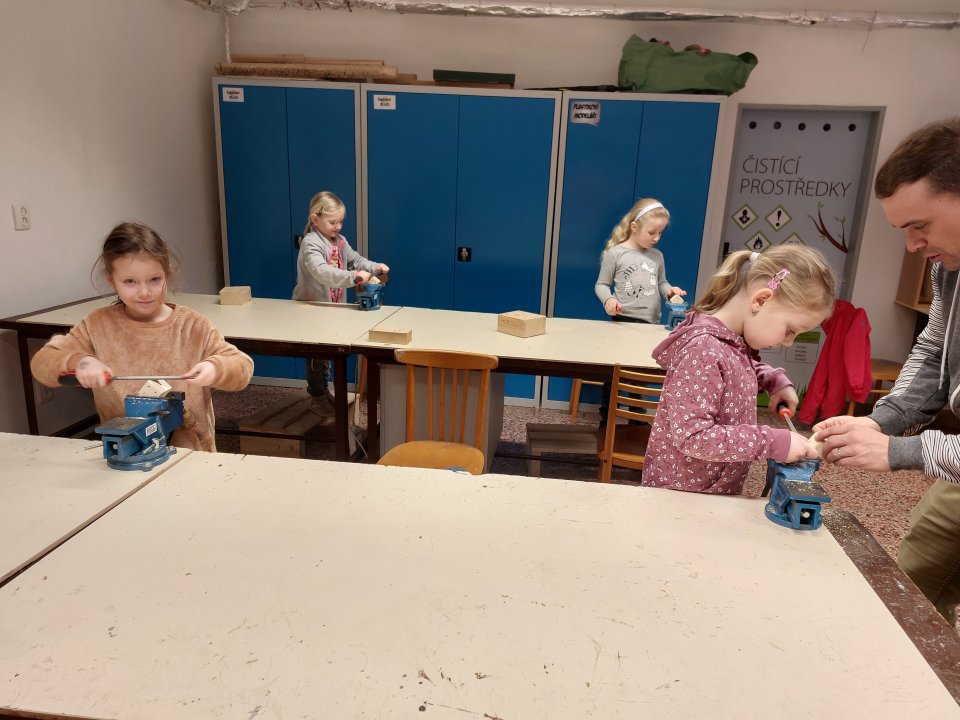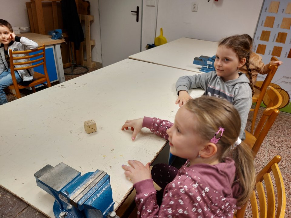 Děti začaly vyrábět hrací kostku. Práce byla prostřídána hrou - házení kostkou(sčítání), zatloukání hřebíků ve trojici. Děti pracovaly se svěrákem, vrtačkou, rašplí a kladivem. Na závěr si prohlédly zvířátka na zahradě SVČ a prohrály si na průlezkách