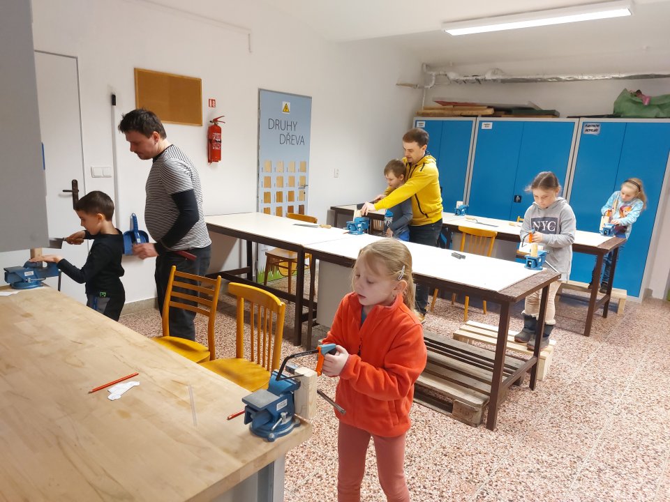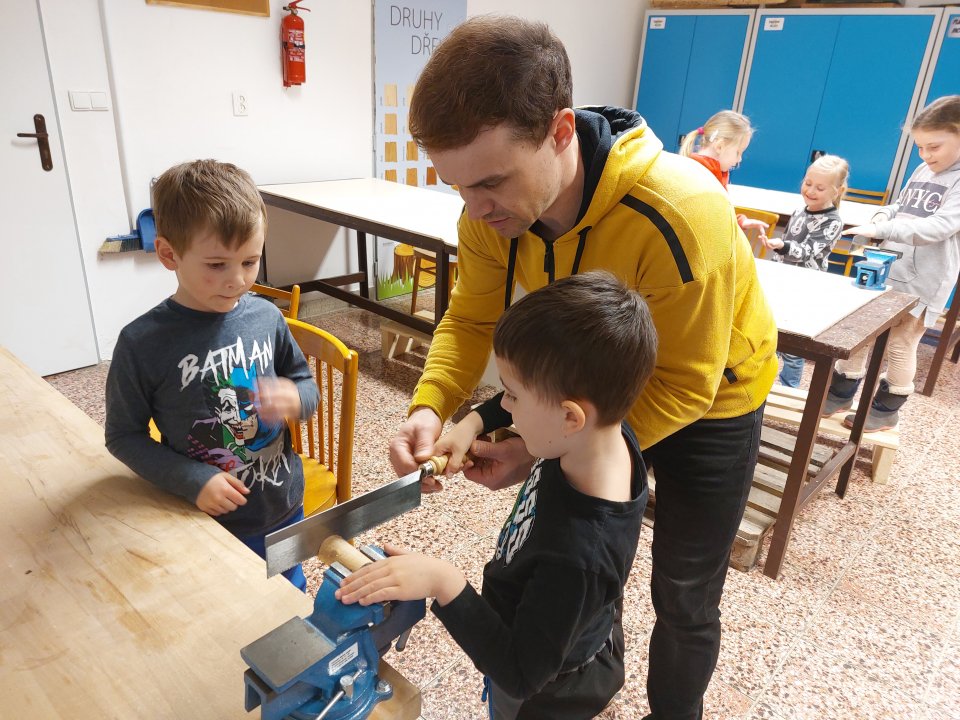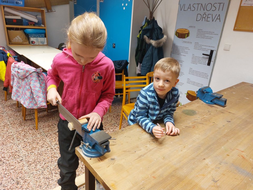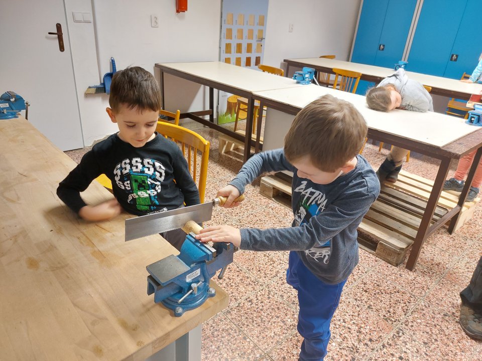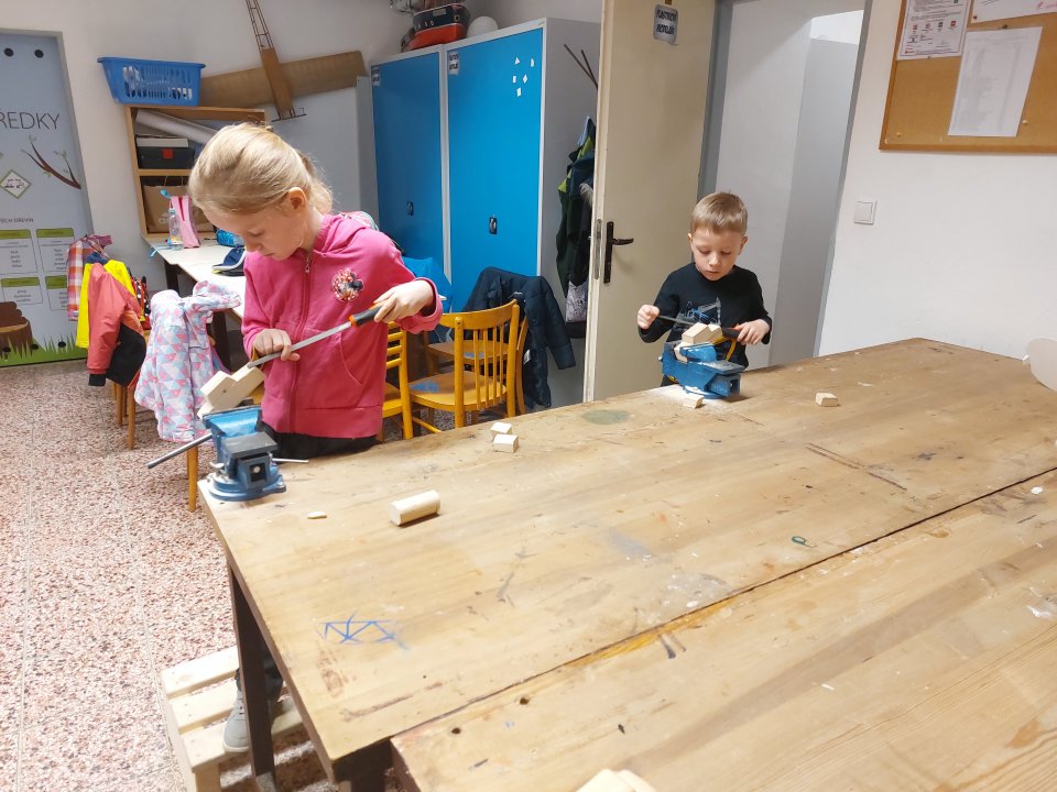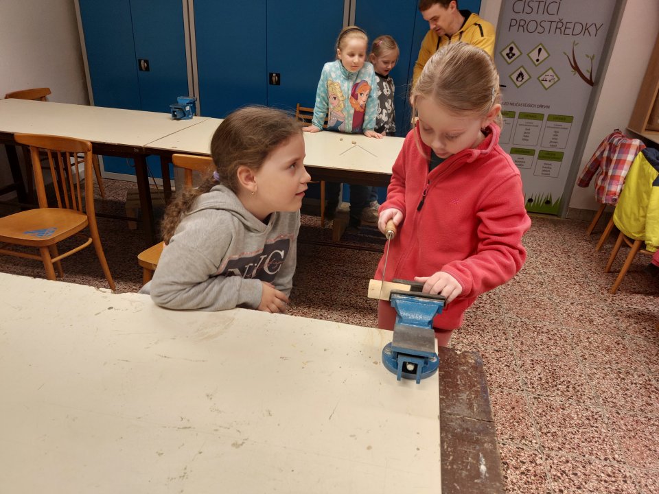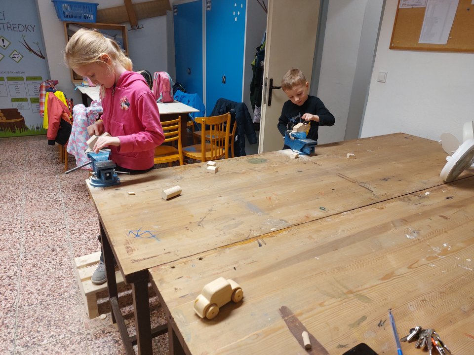 Vyrábíme auto - pracujeme se svěrákem, používáme různé pilky, rašple a pilníky.