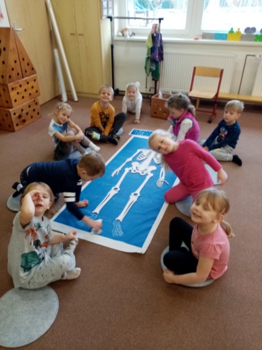 Povídáme si o zdraví, o předcházení úrazům, hrajeme si na lékaře. Pojmenováváme části těla a seznamujeme se s kostrou i orgány v těle.