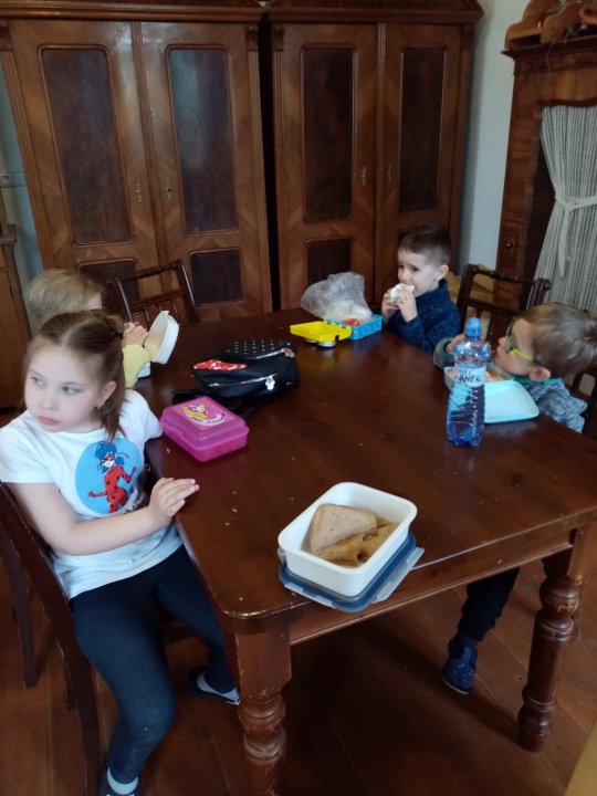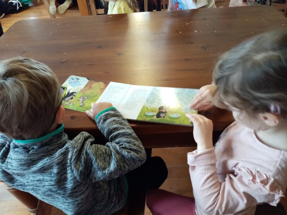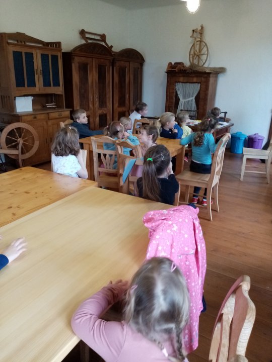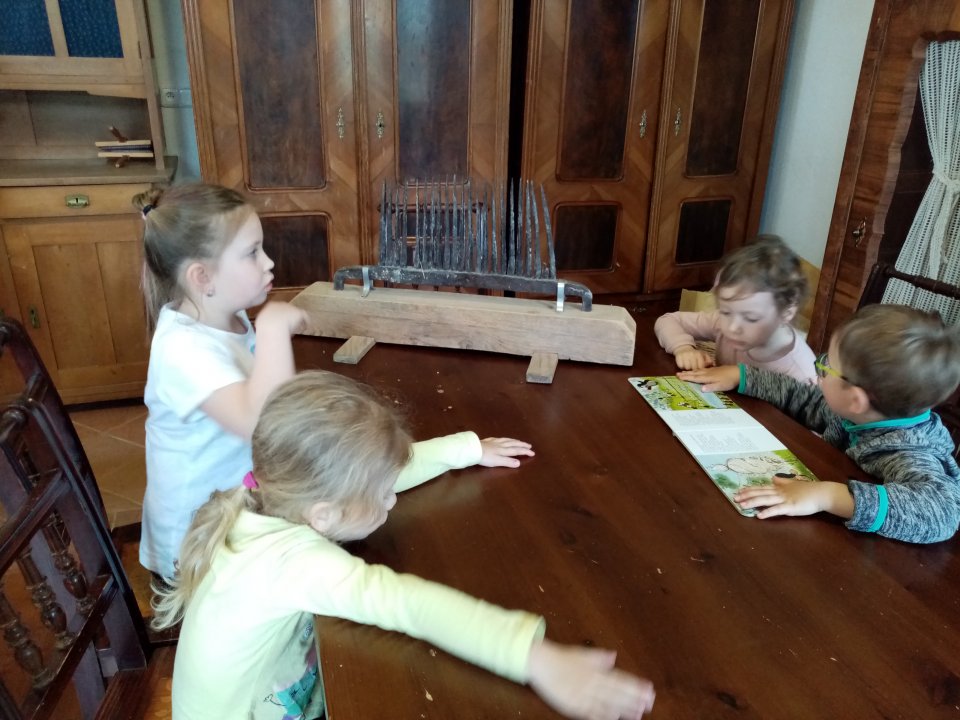 Na farmě děti byli seznámeny s výrobou lnu prostřednictvím pohádky "Krtek a kalhotky". Viděly len, hřeben na česání lnu, stav na tkaní i starý šicí stroj. Povídání o zvířatech na farmě bylo zakončeno vyprávěním o ovcích a vlně. Děti viděly i kolovrat. Vyrobily si obrázek ovečky dolepováním vlny na předtištěný obrázek. Potom jsme si prohlédli celou farmu. Některá zvířata jsme si i pohladili. Na závěr jsme ochutnali pečivo, které upekli naši školáci a namazali jsme si ho máslem, které děti stloukly.