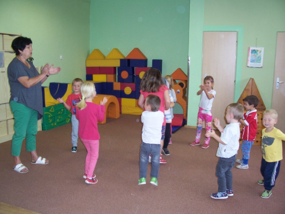 Ráno přivítala děti p.učitelka Z. Zukalová. Starší děti zahrály novým dětem pohádku O Budulínkovi. Dále se děti seznámily i s p.školnicí D. Oujezdskou a p. kuchařkou H. Svobodovou. V průběhu dopoledne p. uč. S. Bělíková zabavila děti pohybovými hrami. První den v MŠ bez rodičů zvládly nové děti s úsměvem.
