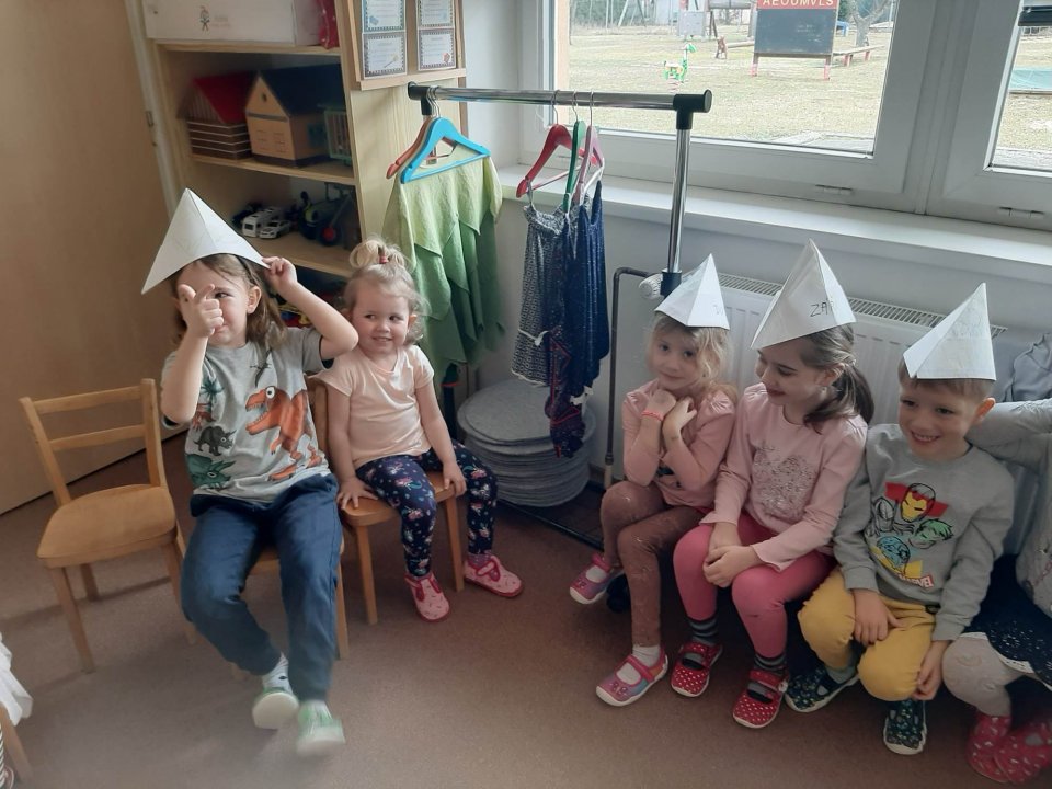 Každý měsíc jinou čepici nosí. Umíme novou píseň "Měsíce" tzn., že víme kolik má rok měsíců a jak se jmenují. Děti si po shlédnutí pohádky " O dvanácti měsíčcích" poskládaly z papíru a čepice a nazdobily si je.