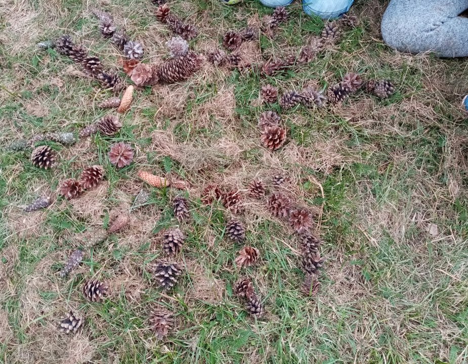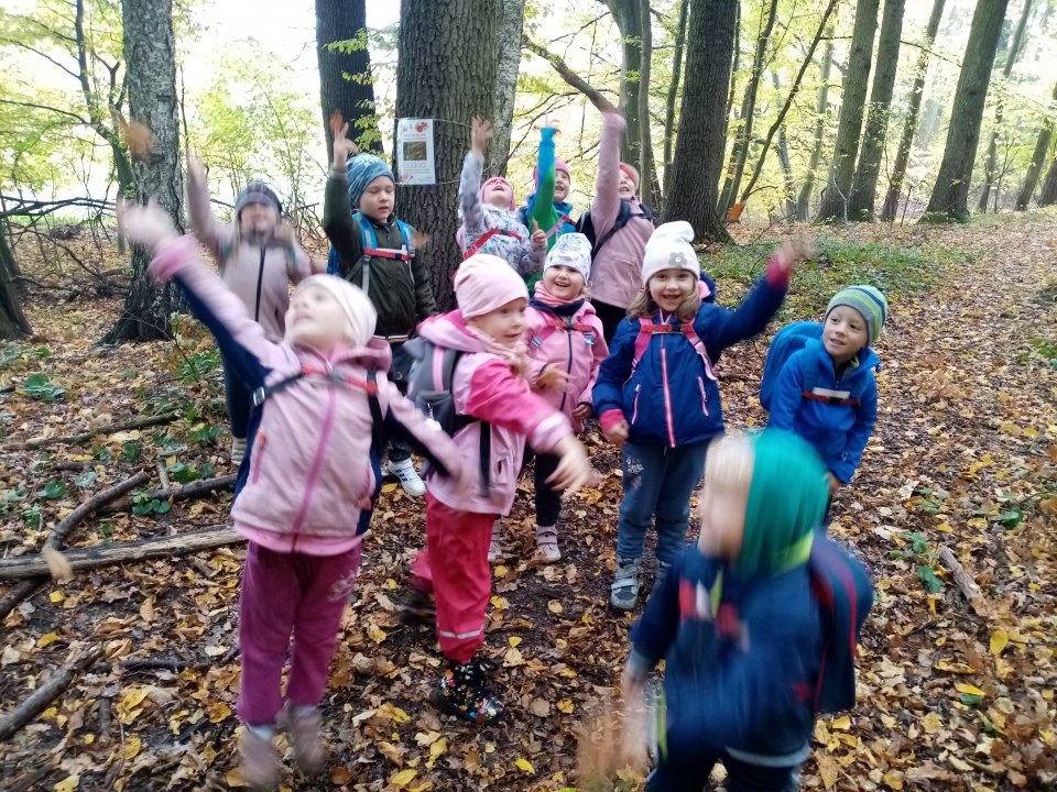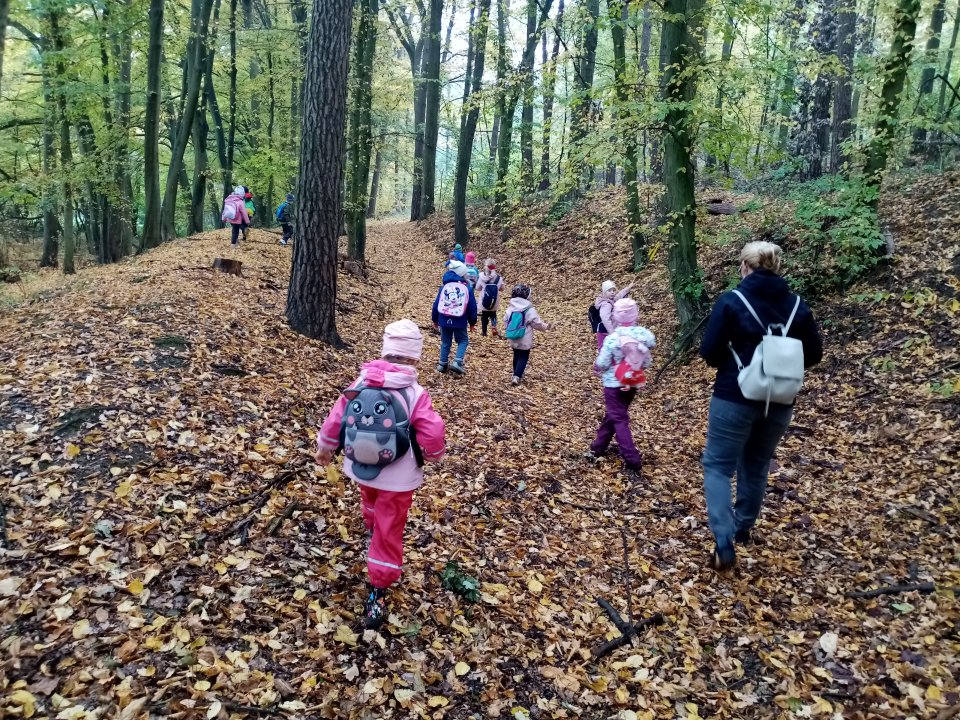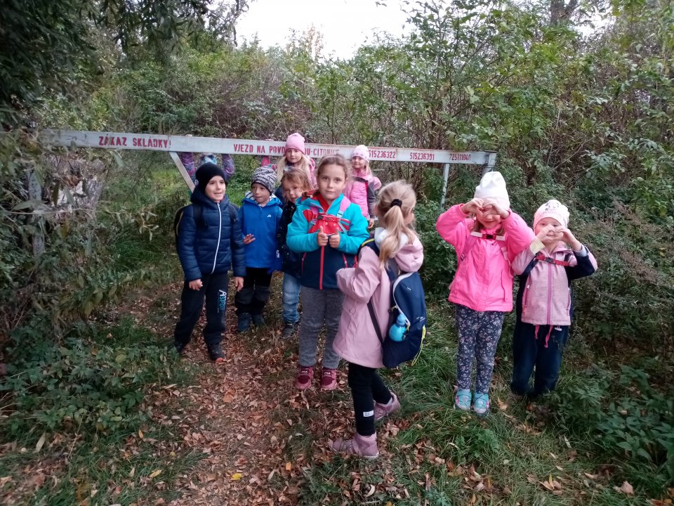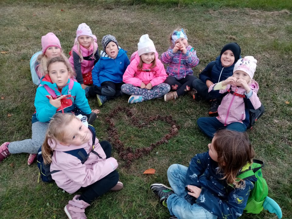 12.10.2022 : Vycházka s pozorováním změn v přírodě ( zoraná pole, sklizeň na zahradách, co je to kosa?, určování stromů a rostlin - kakost luční, vrba jíva, jírovec maďal...), běh do kopce, slalom mezi stromy, "Čáp ztratil čepičku", skládání obrázků ze šišek ( srdce, slunce).