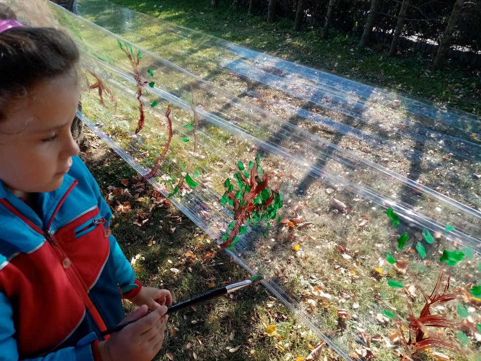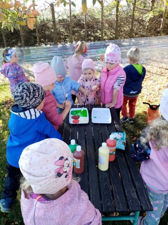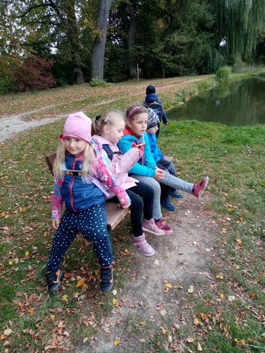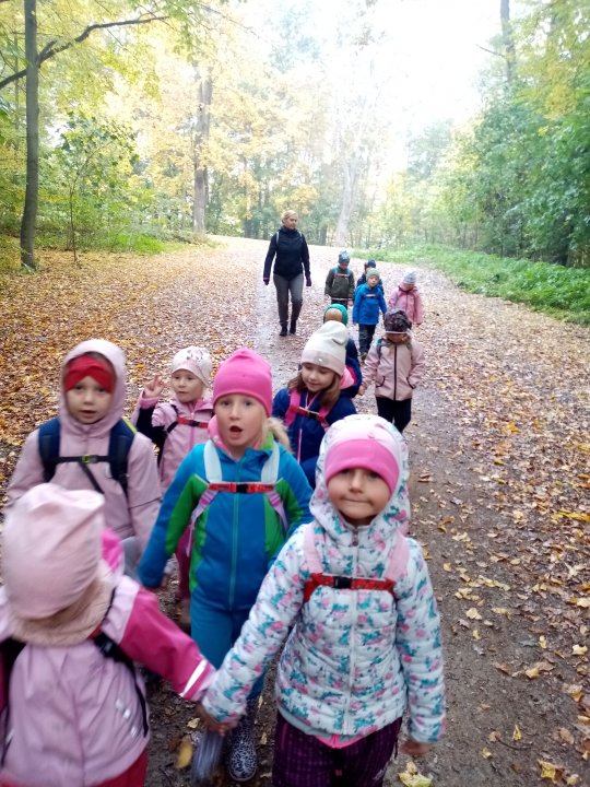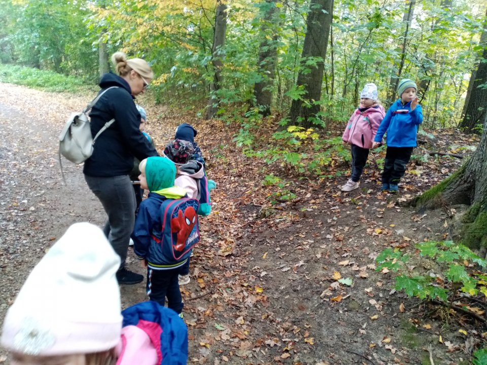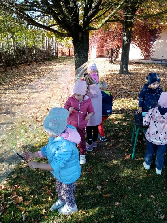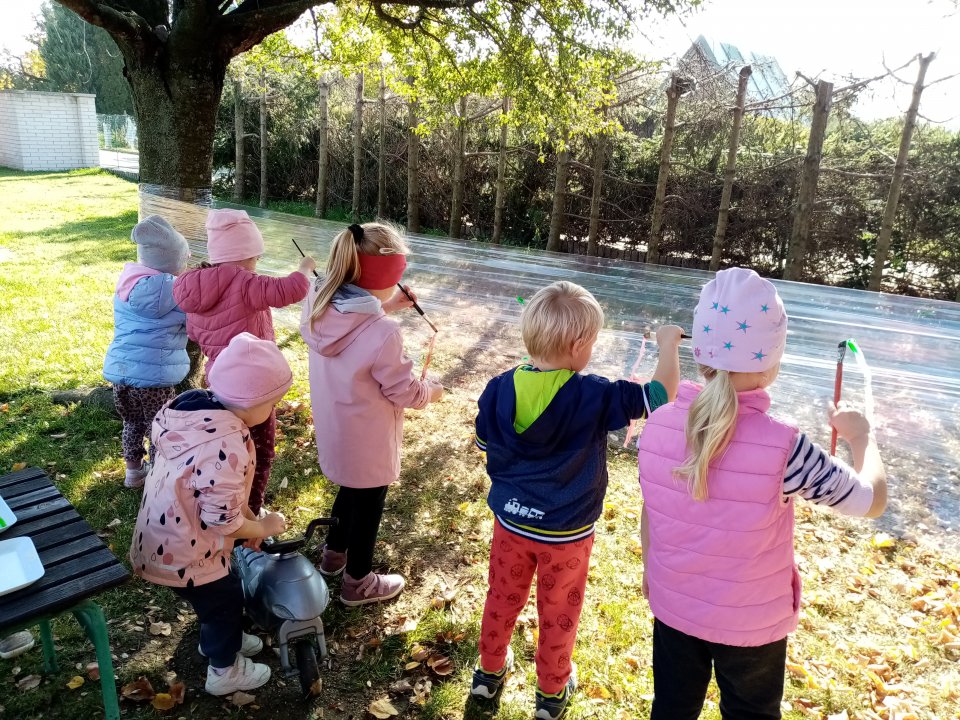 12.10.2022 : Vycházka s pozorováním změn v přírodě ( zoraná pole, sklizeň na zahradách, co je to kosa?, určování stromů a rostlin - kakost luční, vrba jíva, jírovec maďal...), běh do kopce, slalom mezi stromy, "Čáp ztratil čepičku", skládání obrázků ze šišek ( srdce, slunce).