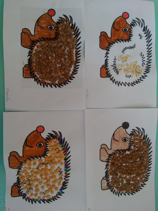 Ježci - lepení semínek, práce s vlnou, malování barvami, ...