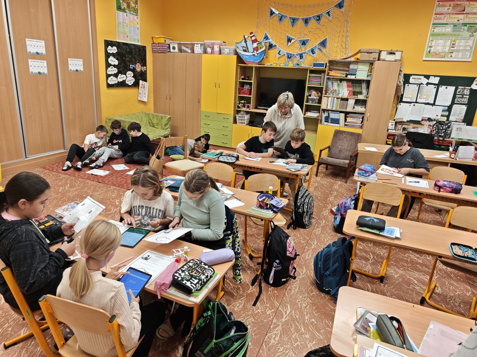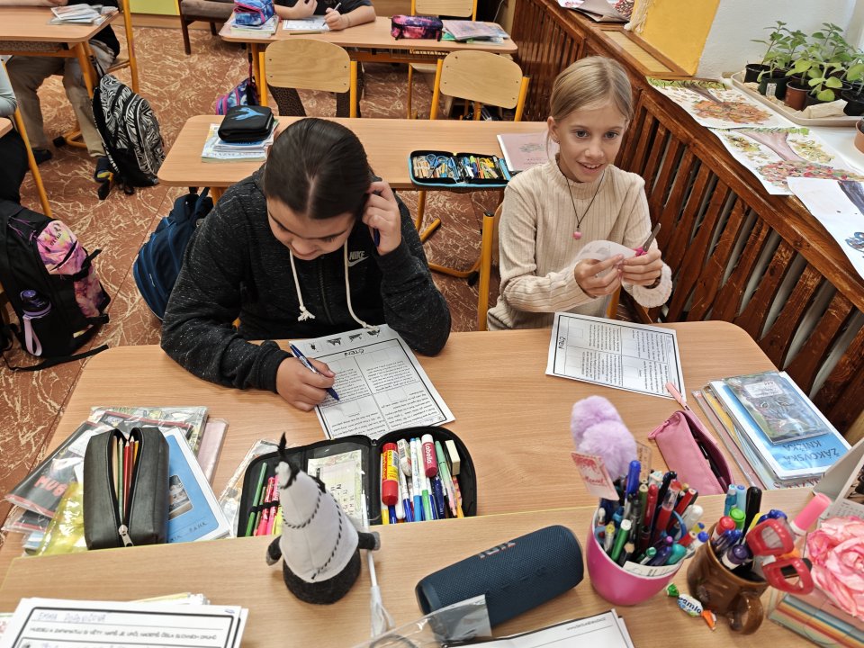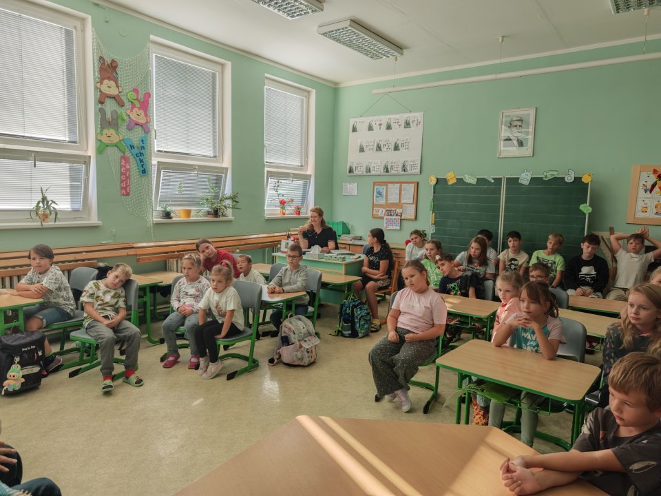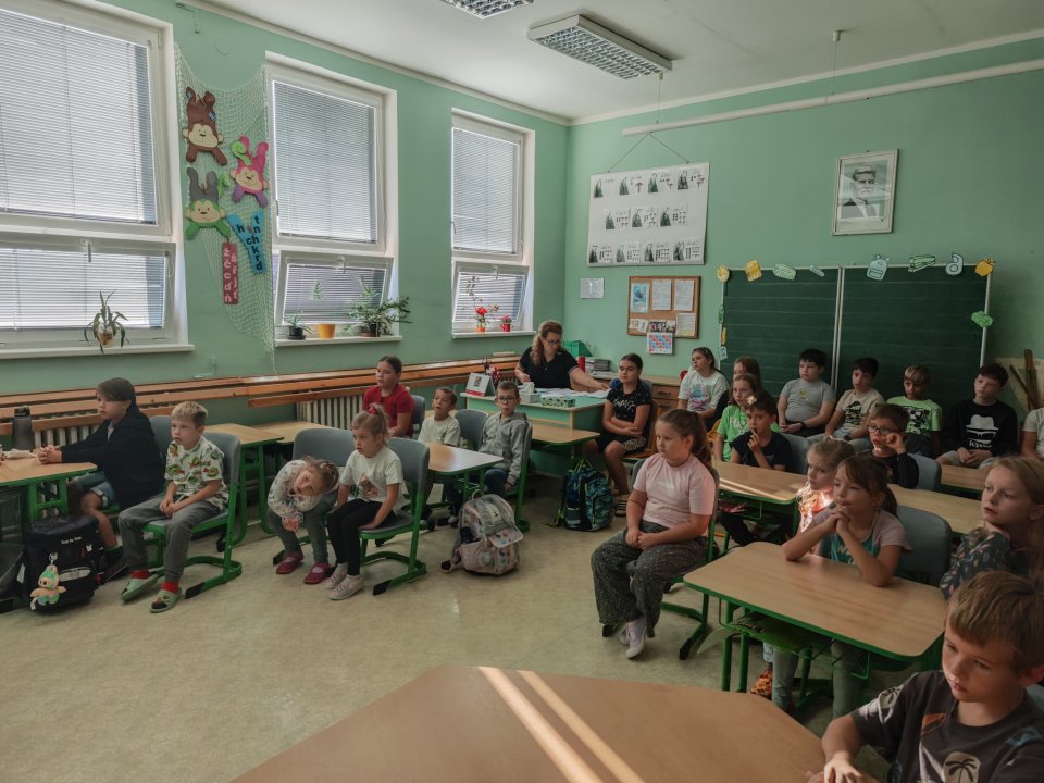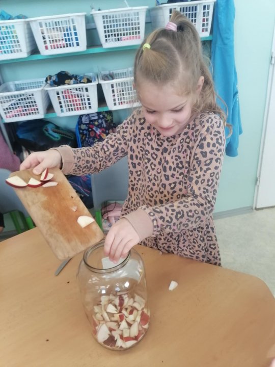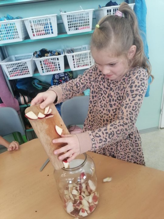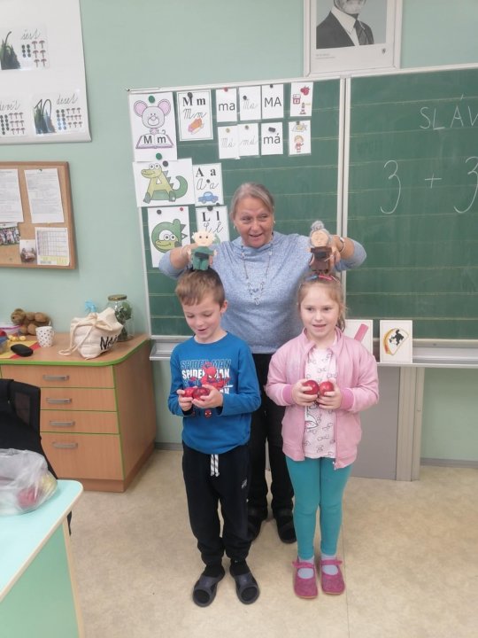 Dnes jsme s prvňáčky v rámci matematiky a čtení zavařovali jablíčka, krájeli, vyráběli jablečný ocet, zpívali a trénovali písmenka.
