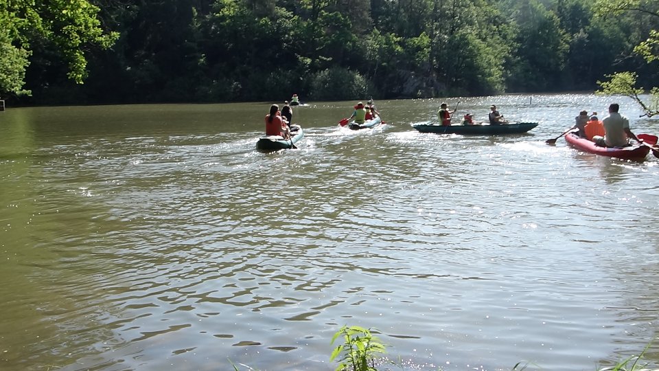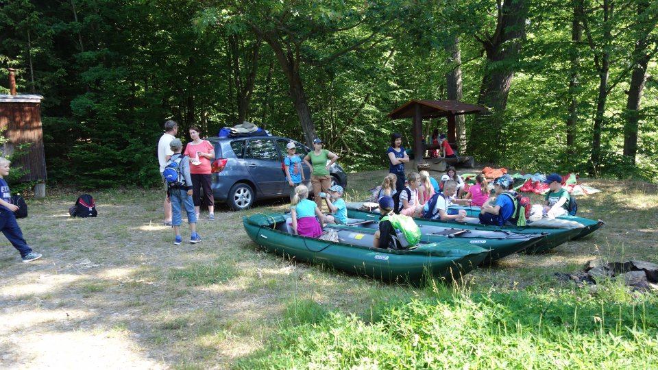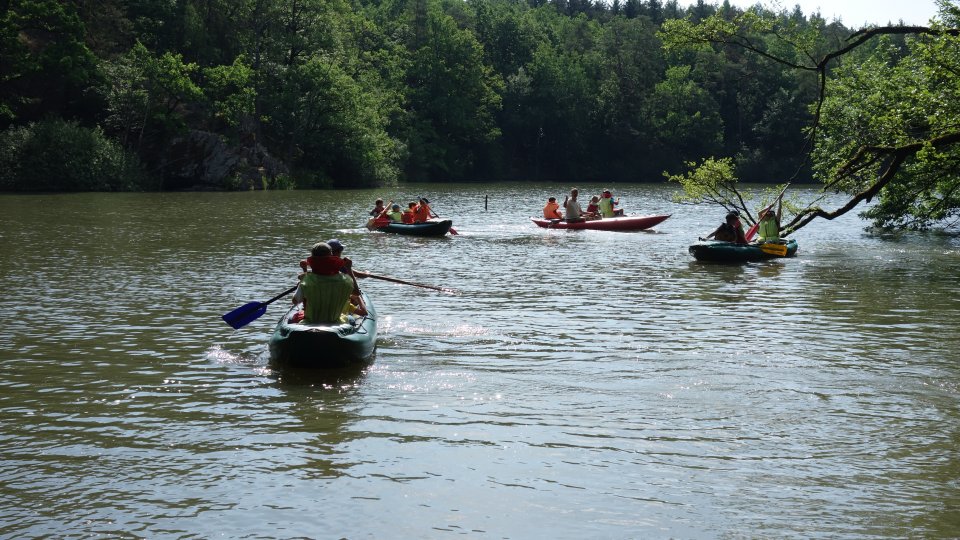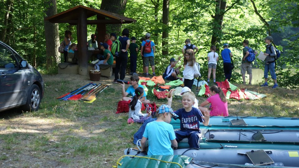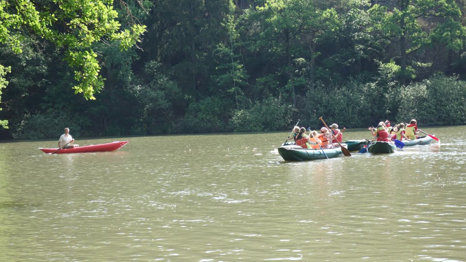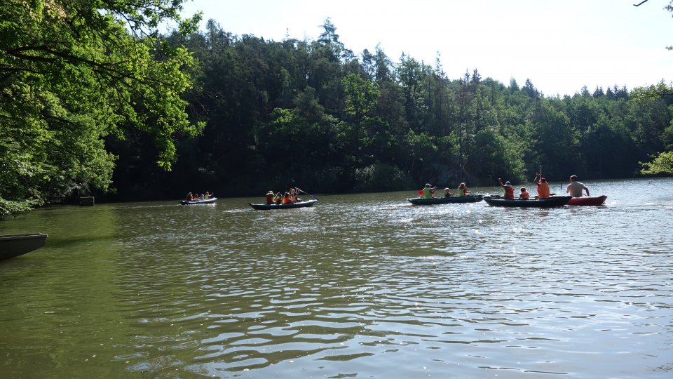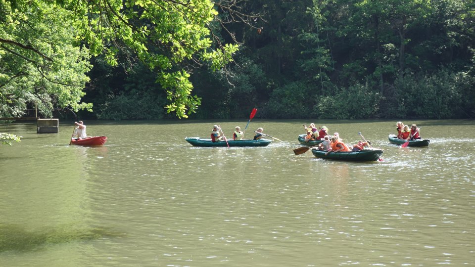 Ke Dni dětí byl dnes zorganizován malý putovní výlet vlakem a pěšky k rybníku Vlkov. Překvapením byla flotila pěti parádních nafukovacích kánoí, které pro nás sehnal a připravil pan Tomáš Vocilka, za což mu velice děkujeme. Součástí celé cesty bylo i plnění připravených soutěžních úkolů. Přidáváme pro představu pár foteček z celé akce