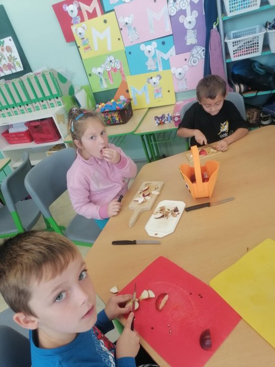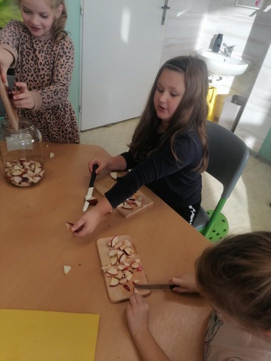 Dnes jsme s prvňáčky v rámci matematiky a čtení zavařovali jablíčka, krájeli, vyráběli jablečný ocet, zpívali a trénovali písmenka.