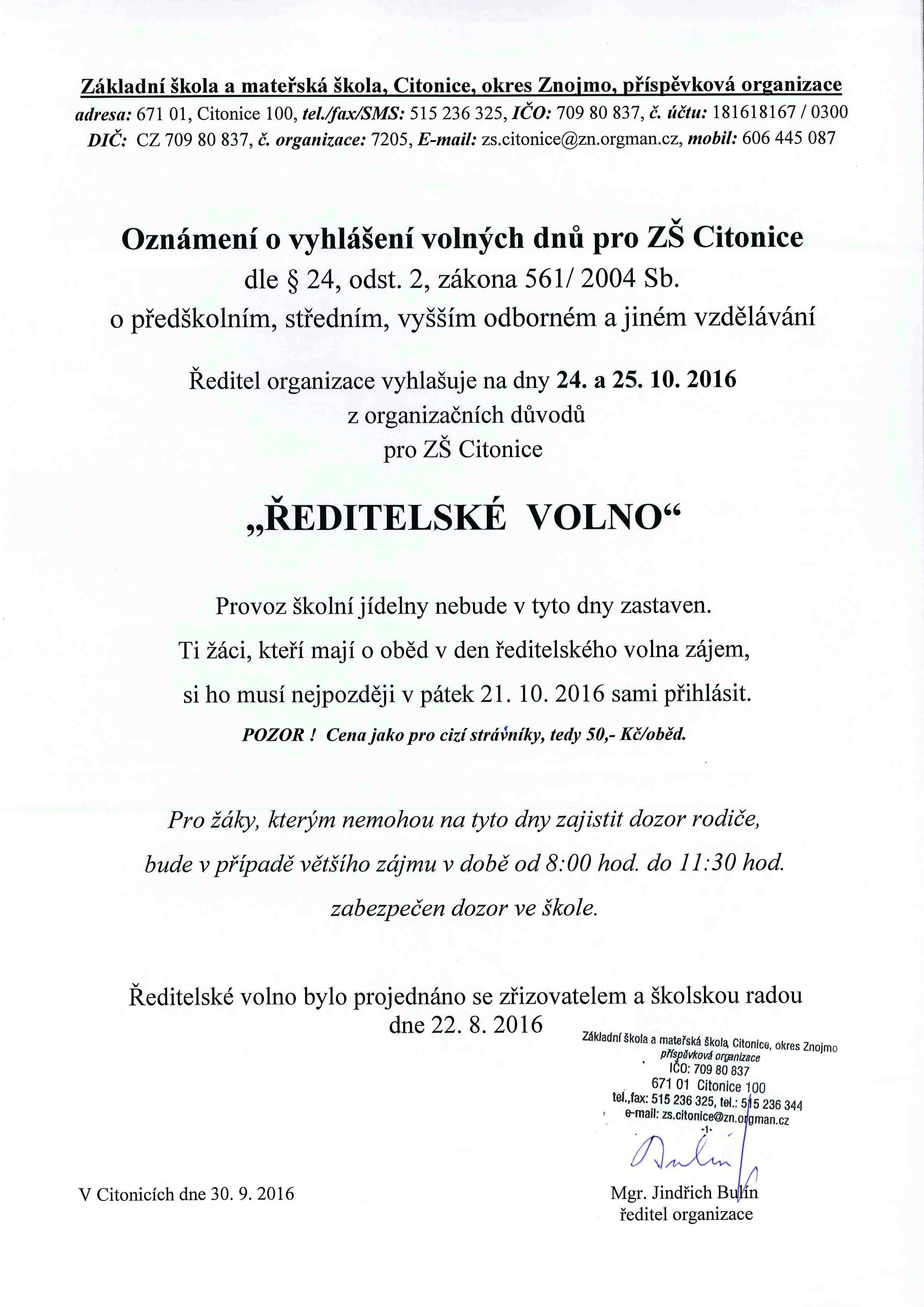 Ředitelské volno ZŠ
